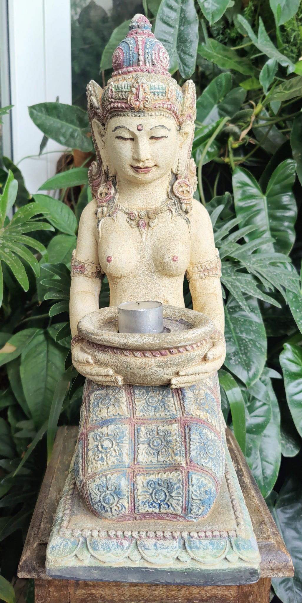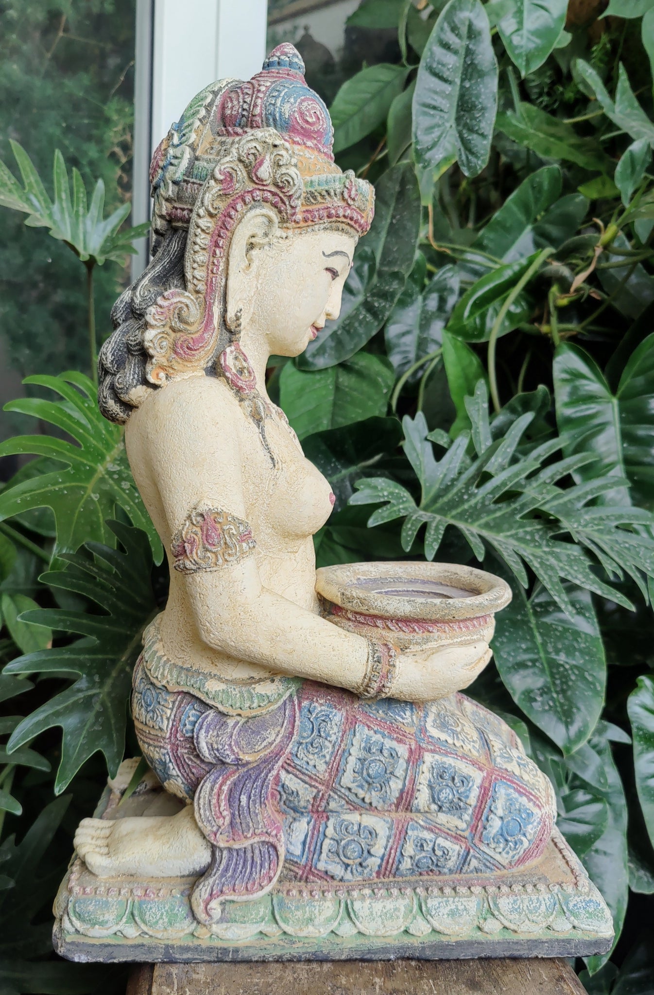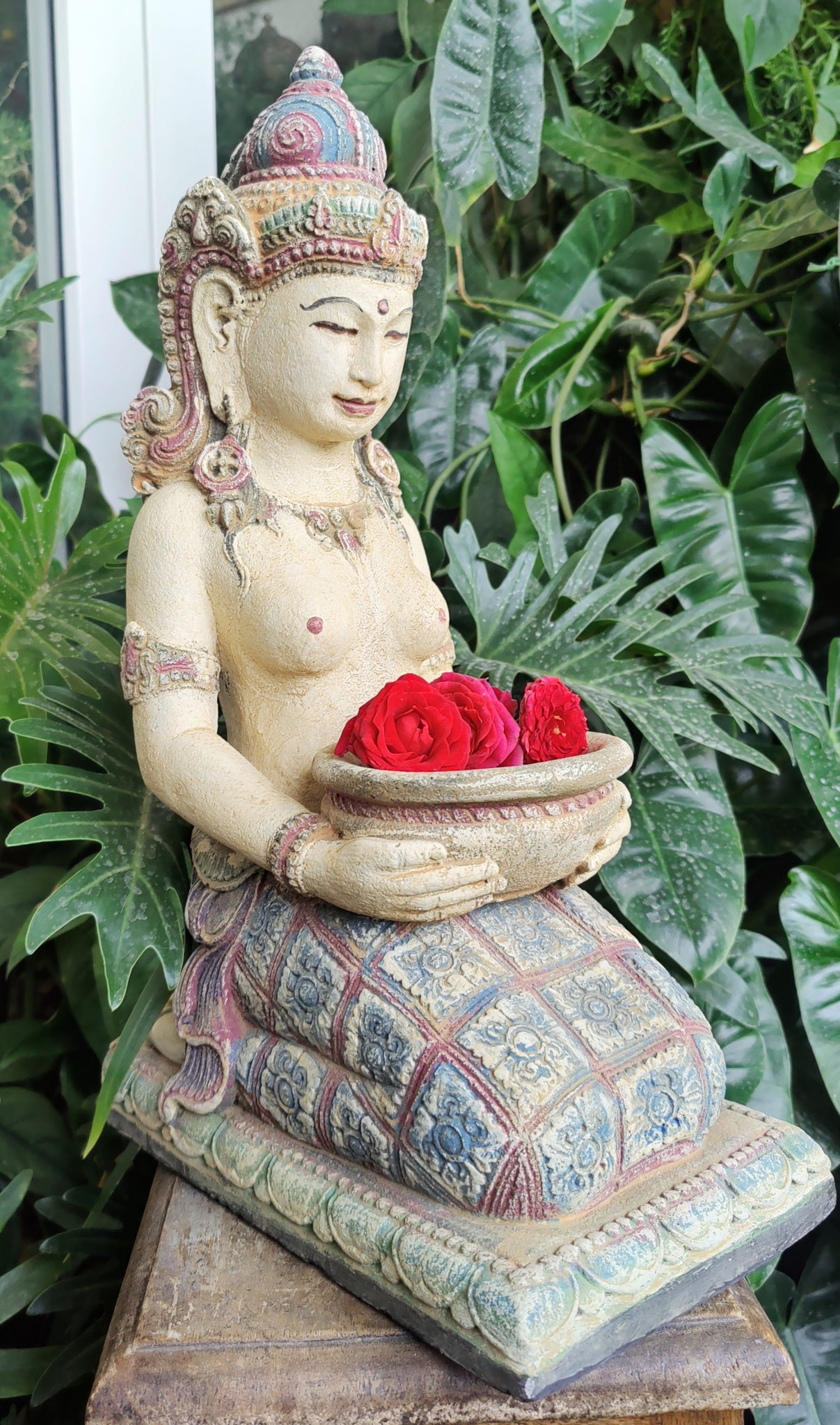 Our Colourful Dewi Sri Goddess Garden Statue is kneeling with an offering bowl & beautifully adorned in Balinese dress. The bowl in her hands is suitable for a candle, flowers or maybe even incense. This special Goddess will look equally gorgeous in your garden or inside you home or sacred space.