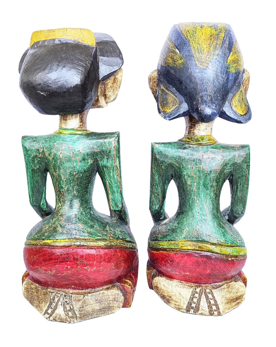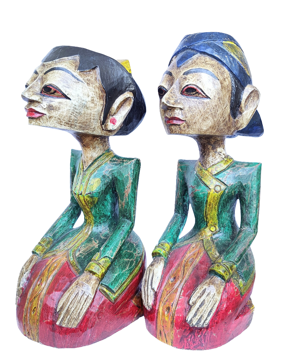 The carved wooden figures represent the “Inseparable Couple” ideal of the Javanese and Indonesian cultures. . These sculptures are made to depict Dewi Sri, a goddess of fertility, and Sadona. This home accessory is a symbol of harmony which should add a global sophistication to any surface.