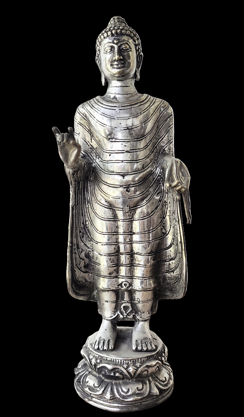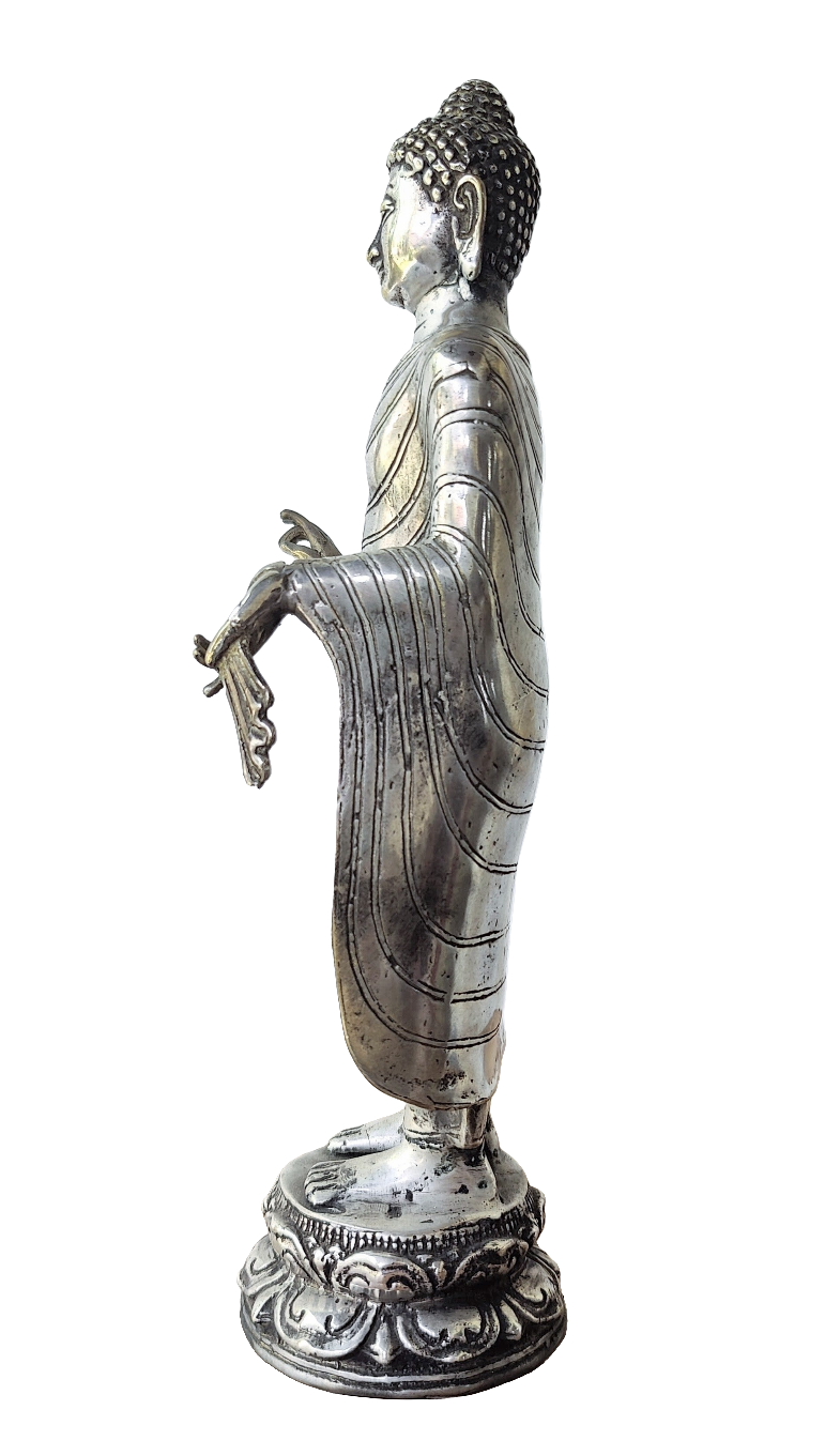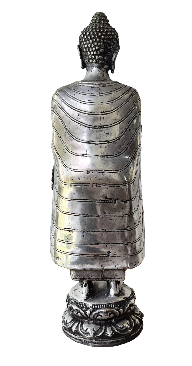 A nicely detailed standing robbed Buddha standing on a lotus pedestal base.