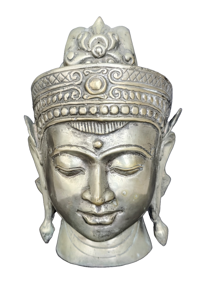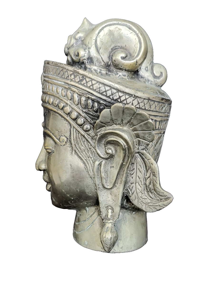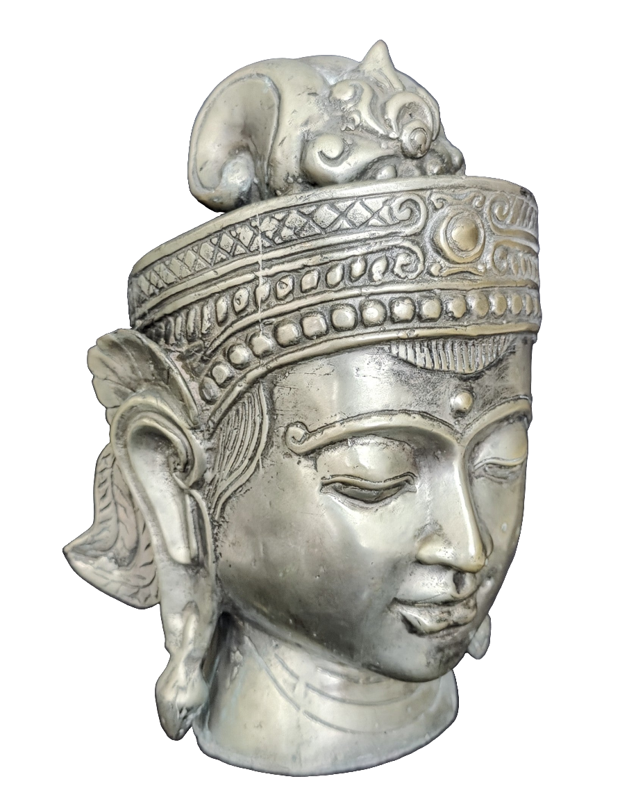 A cast head of Lord Buddha in antique silver plating finish, is depicted with a crown, angular features, eyelids closed and elongated earlobes.