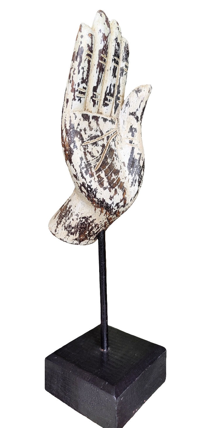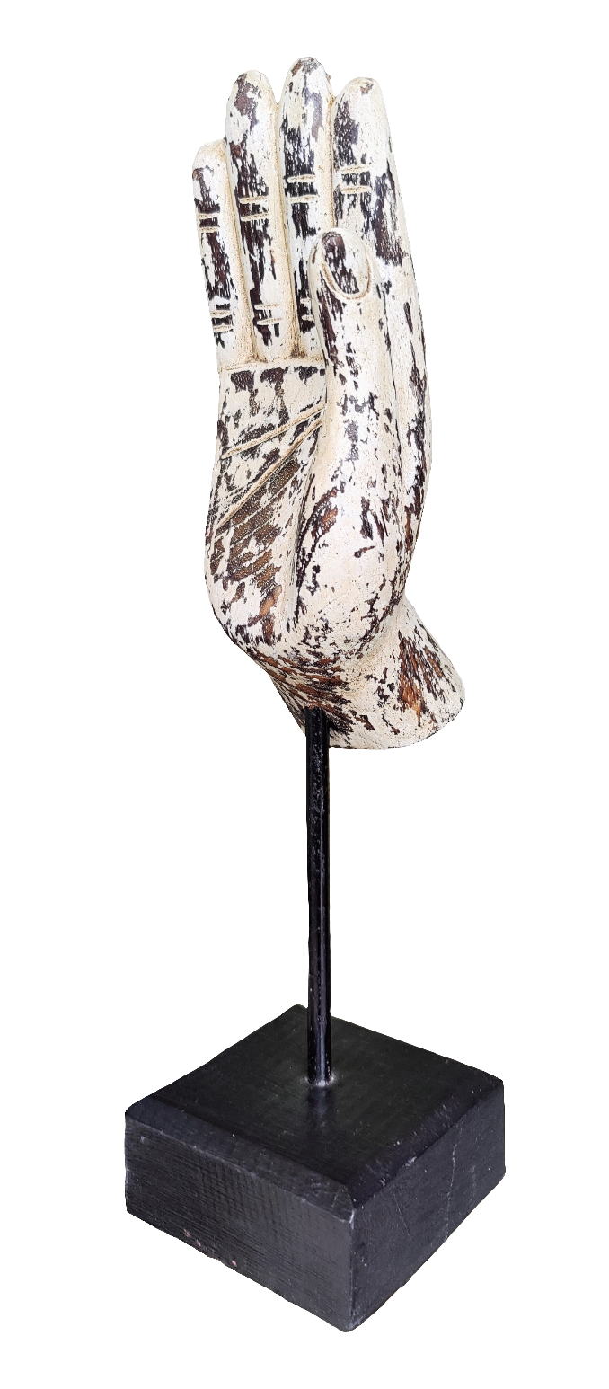 Home Decor. Tabletop Ornament. Buddha Hand Sculpture in Wood mounted on rustic wooden base.