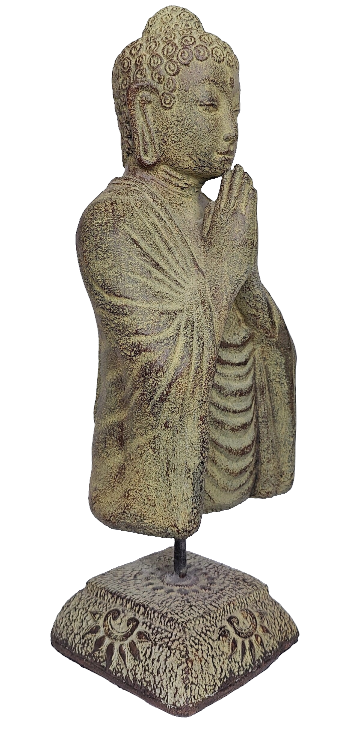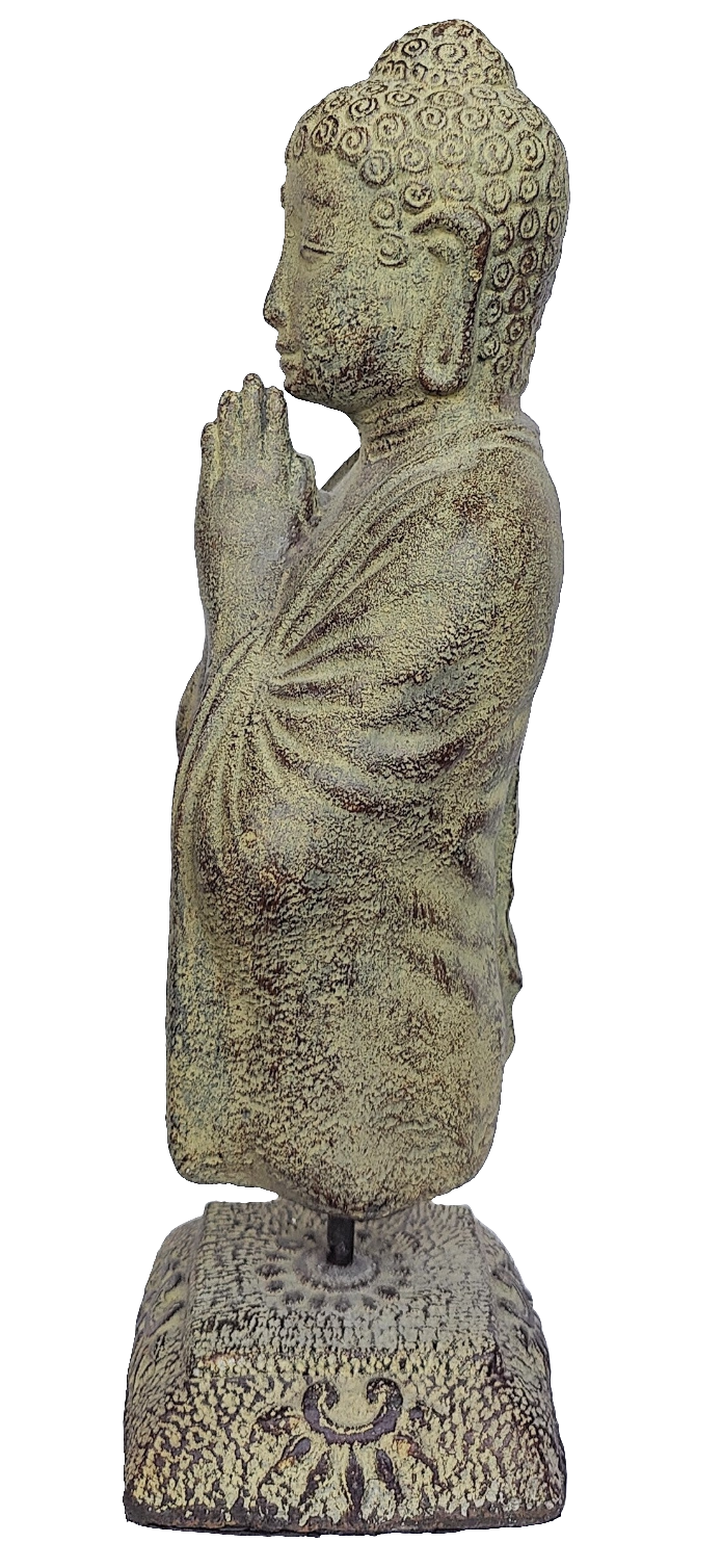 Lord Buddha has both his hands pressed together in front of his chest in the anjali mudra or Namaste hand position.