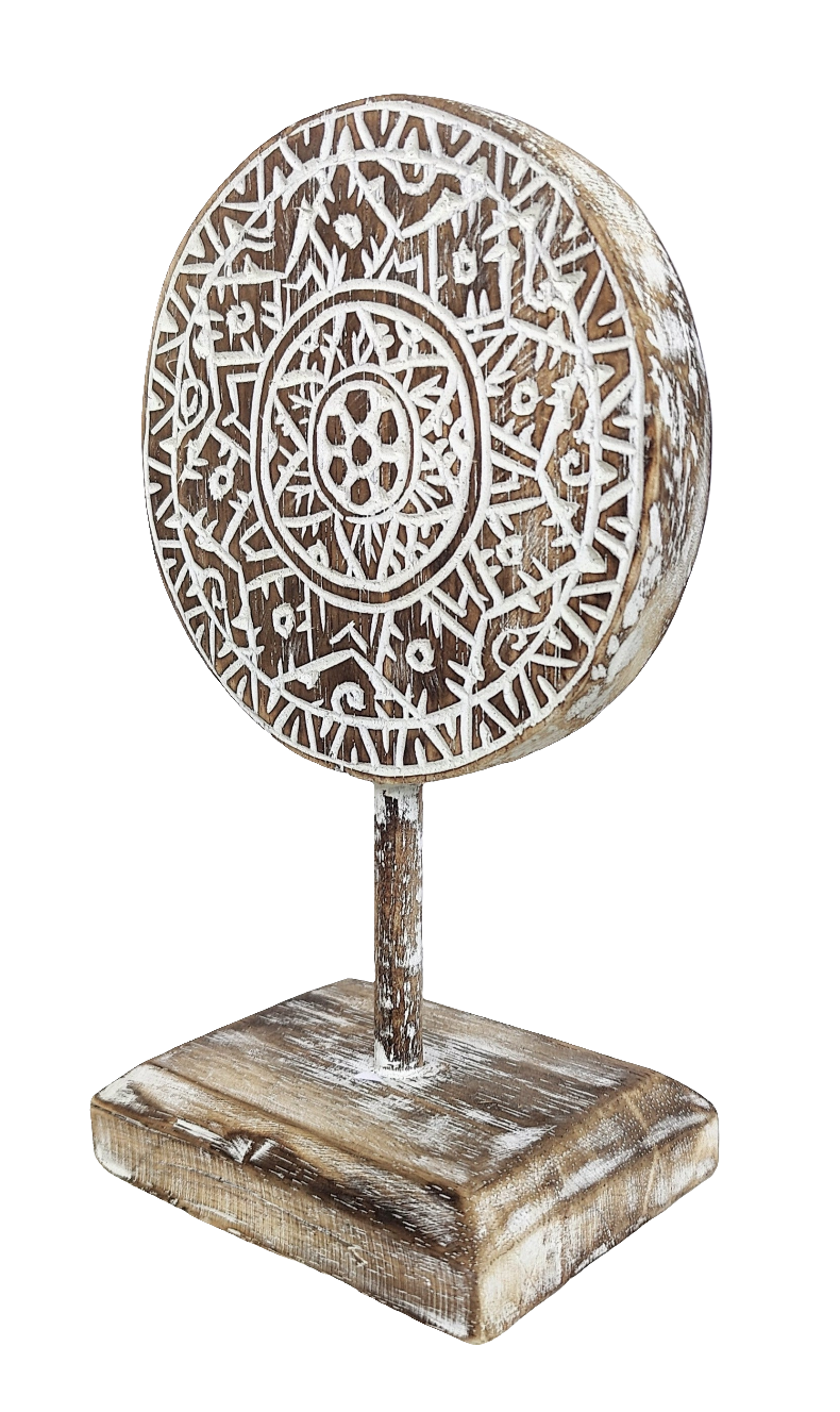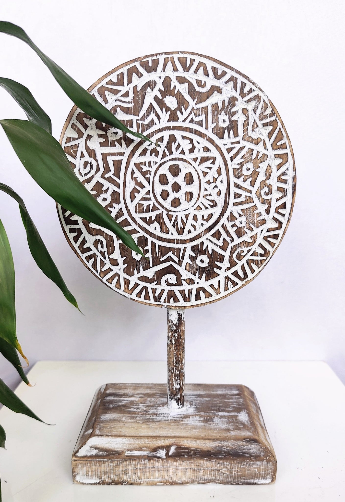 Home Decor: Tabletop Showpiece. Carved Wooden Disc Tribal Design Decor On Stand.