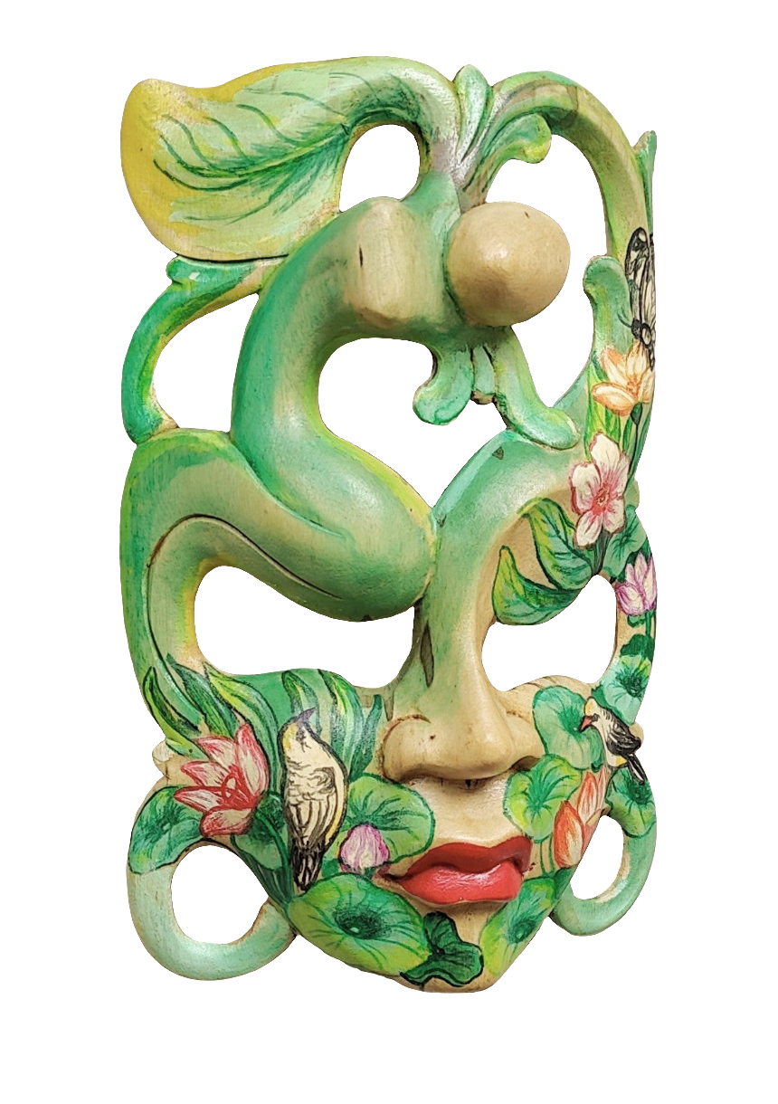 Masterfully hand-carved from a single piece of hibiscus wood. Local artisans create this mask, featuring curling vine patterns, floral design with birds, butterfly and amazing openwork designs.