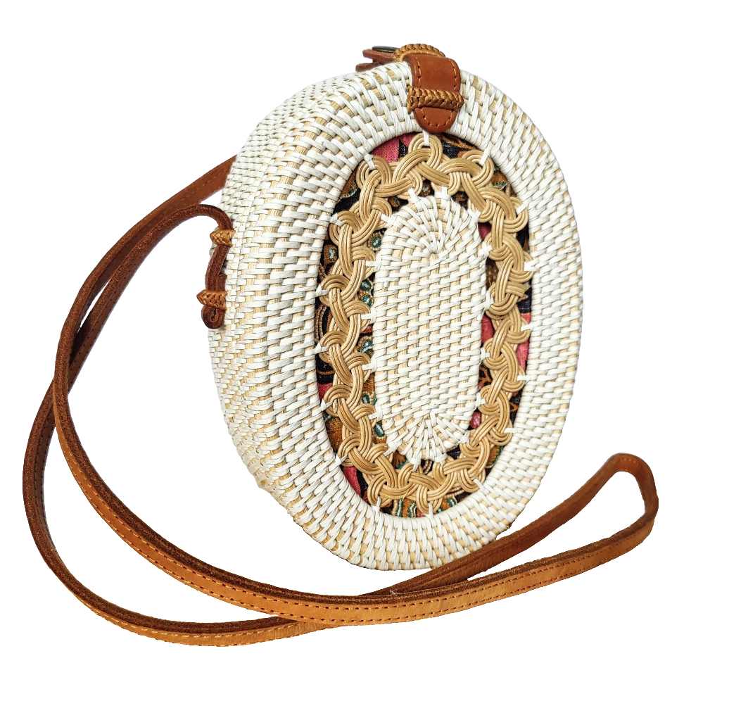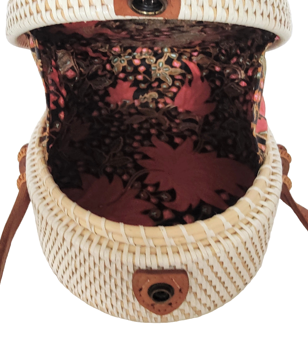Bag has a unique print lining inside (Batik fabric) and a button clasp for.closure.
