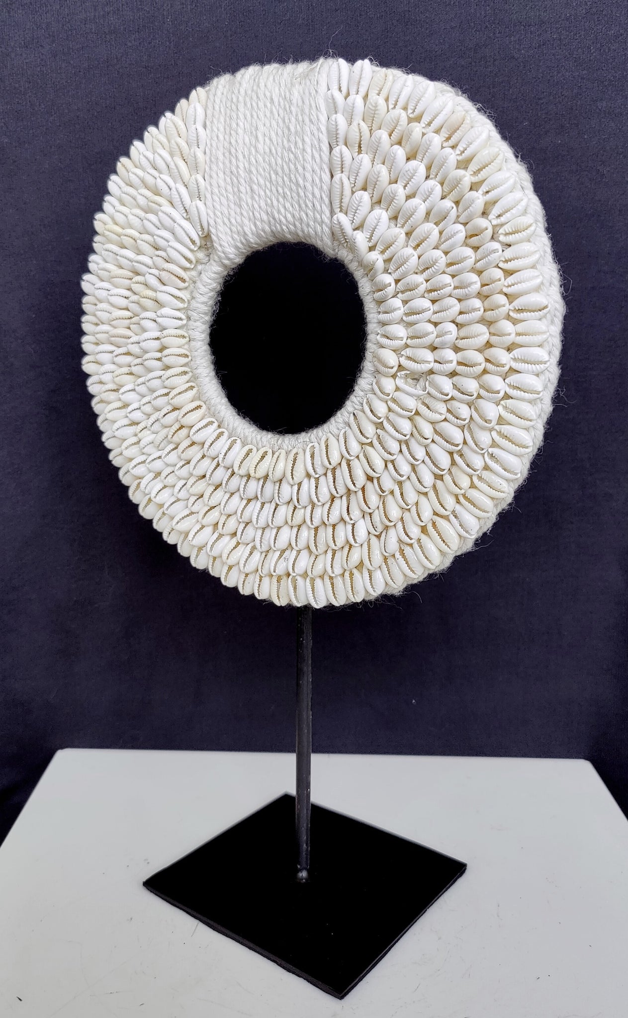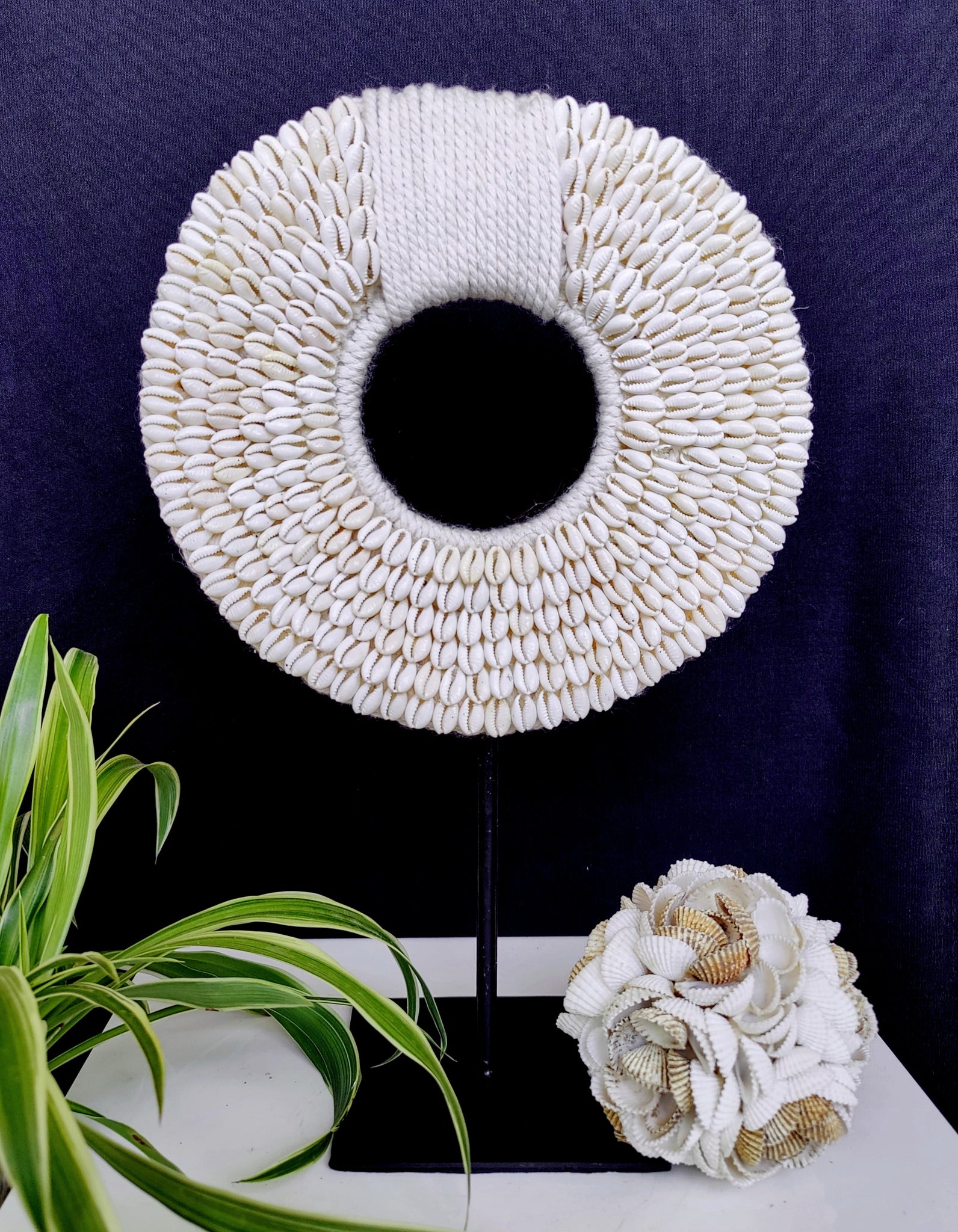 Irian Asmat necklace, decorated with lovely seashells on a macrame of cotton strings background. Would go well for home/office/boutique store/or simply as gift for your loved ones.